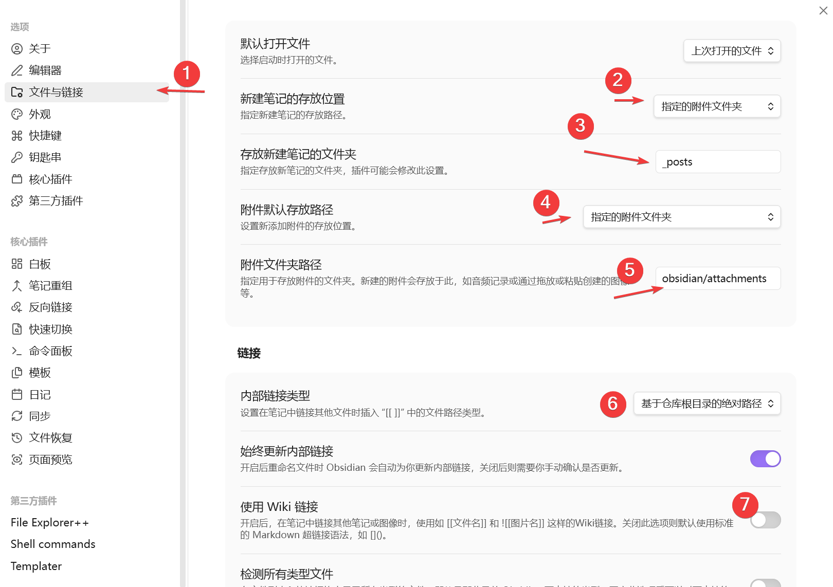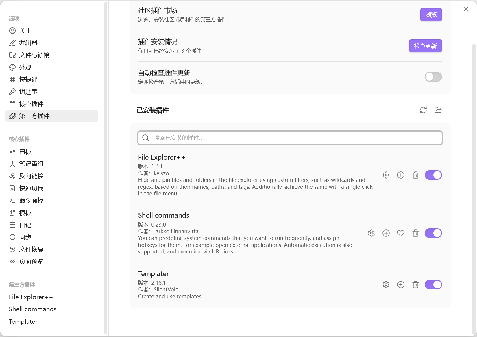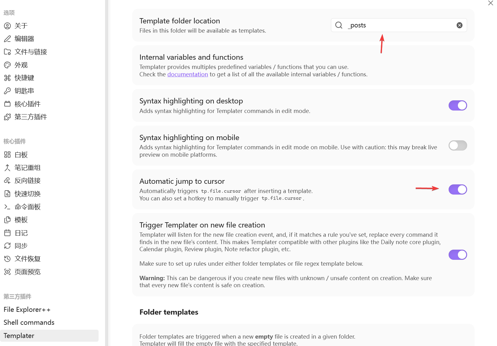 file explorer++, 这个插件是用来隐藏obsidian无关目录的,毕竟要是不小心改动了jekyll部分, 麻烦的还是你.shell commands, 用来执行git命令的, 总不能每一都是手动git add,git commit,git push吧, obsidian里面那个Git插件影响性能, push的时候一卡一卡的, 不推荐用.Templater, 用来生成快速生成文章的, 毕竟不能每次都手动起名字, 输入yaml文件头吧