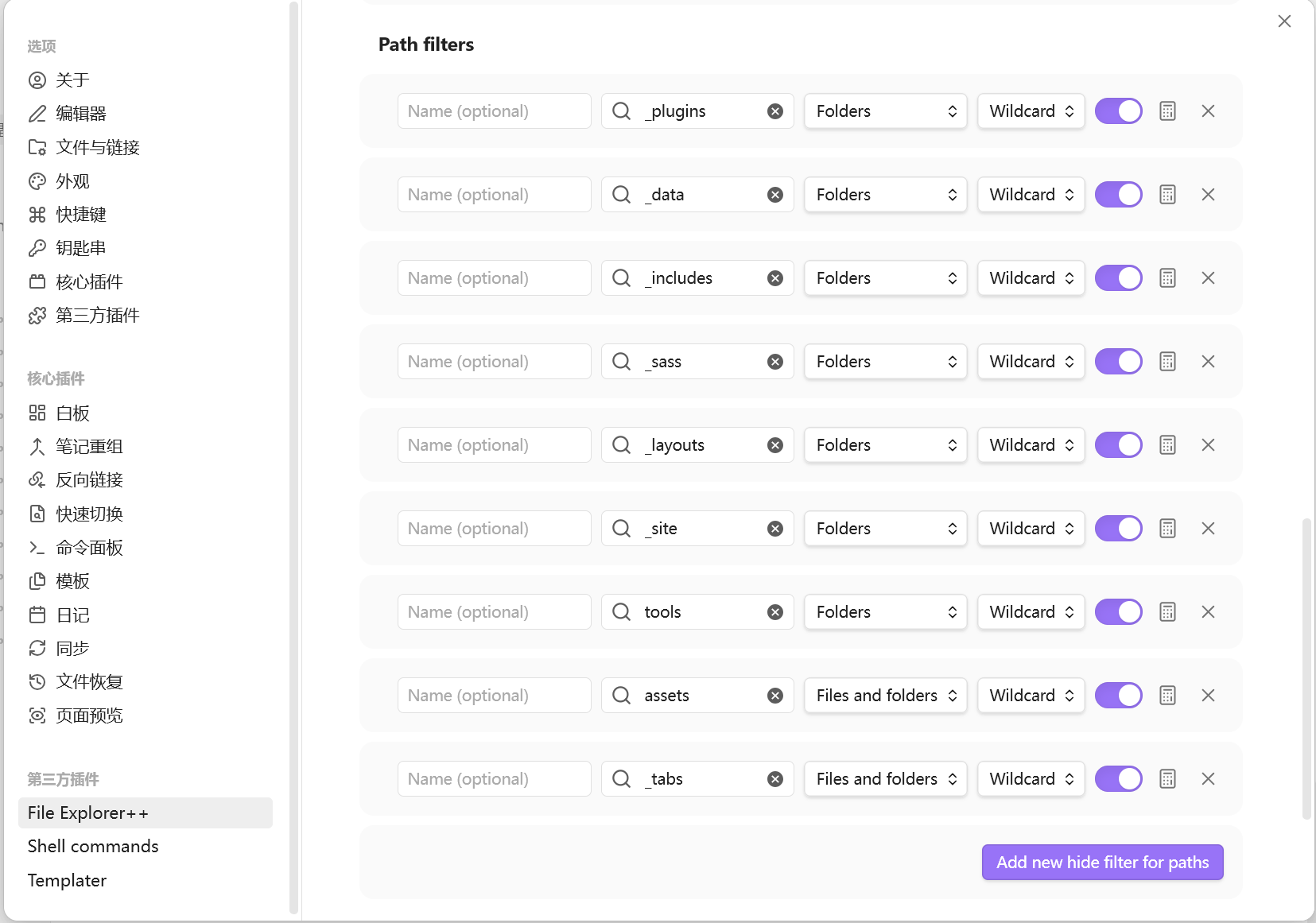 file explorer++往下滚动到Hide Filter下面的Path filter, 就可以隐藏博客写作无关的目录啦