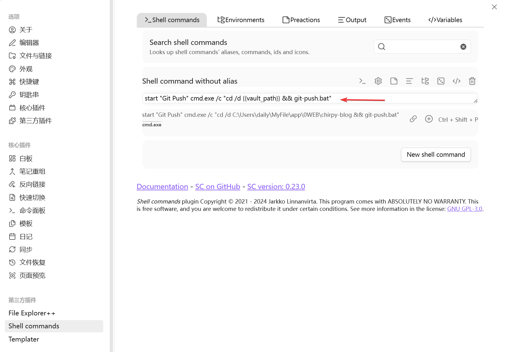 顺便点击右边的+来为其分配快捷键Ctrl + Shift + P. 至于代码中为什么是”Git Push”我不知道, 这是AI生成的, 只有这样才能正确执行我的脚本, ````表示当前obsidian库的绝对目录, 所以, 我们需要在根目录/chirpy-blog/创建一个名为1