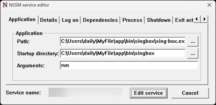 win + r 运行 cmd 命令行输入 nssm install singbox, 注册安装一个服务, 名字无所谓 参考配置,